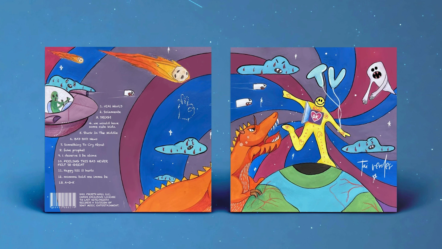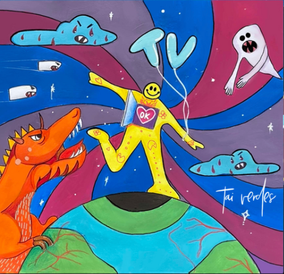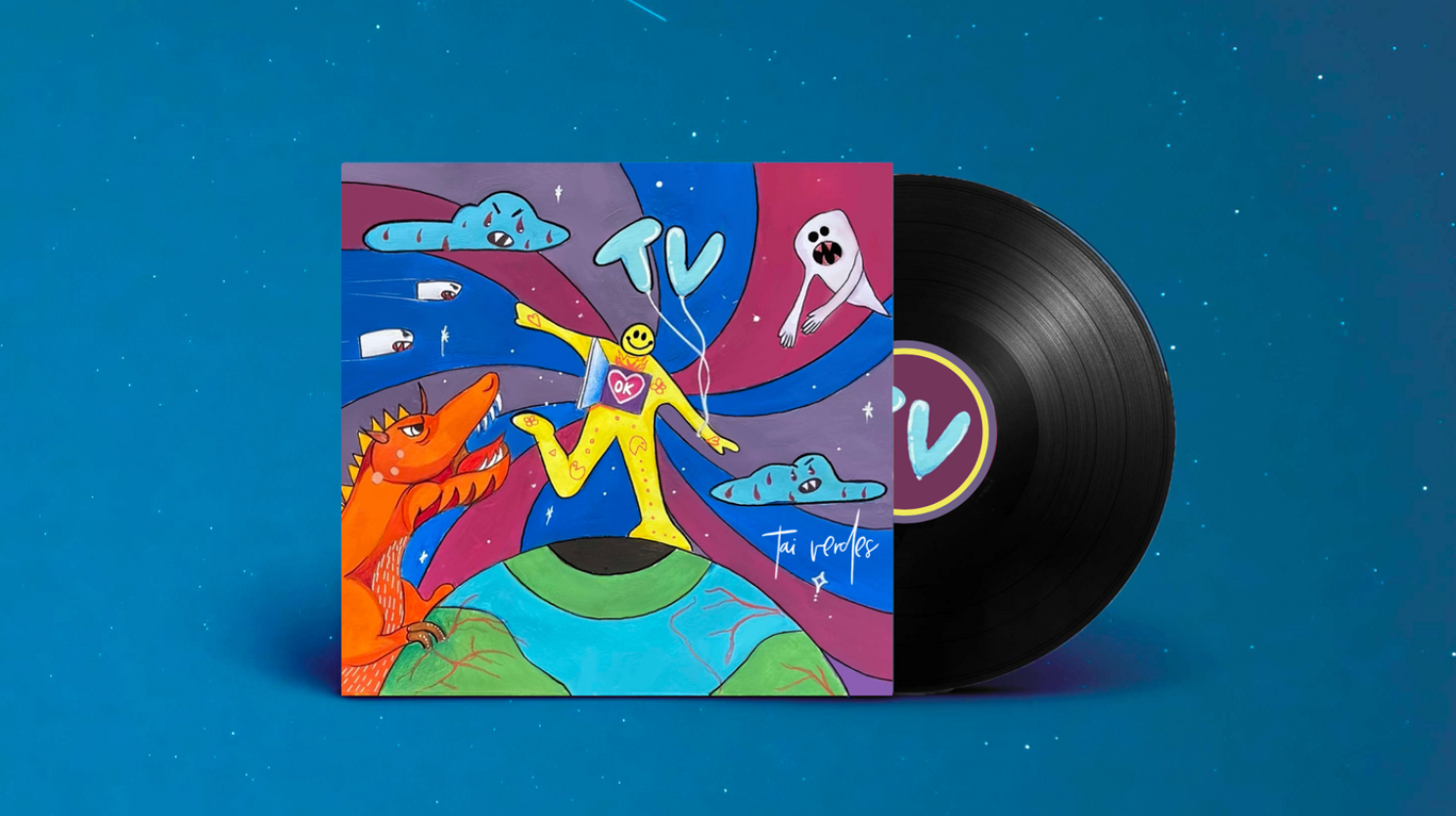 The vinyl design for Tai Verdes' "TV" album is a visually striking composition. It centers around a messy world where the main character minds their business with a carefree smile, emitting a vibrant glow. Abstract shapes and patterns create a sense of movement, reflecting the album's diversity. It encapsulates the album's energy and creativity.